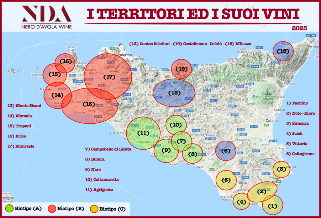 Distingem 18 macro-zone viticole potrivite Nero d’Avola. În realitate există și alte zone bine identificate în Sicilia, dar potrivite în principal altor viță-de-vie.